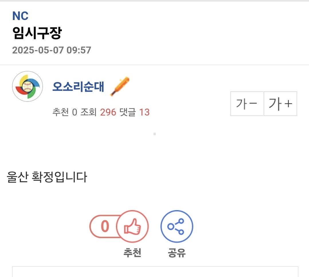 🗨️호랑이 사랑방 🗨️[잡담]자유게시판 잡담 썰) NC 임시 홈구장 해링밀턴 2025.05.22 - 14:56 2025.05.22 - 14:55 울산 문수 추천 수 0 비추천 수 0 Attached file 0671ed34209a9e9bc073c0ce39d63cc7.jpg 44.2KB 11 해링밀턴 님의 최근 글 기아 정해영 망가진다라고 한탄만 하지 말고 157 2025 06.17 이호준 감독이 말히는 마무리 훈련의 중요성 109 2025 06.17 연승기간 선수들 수고 많았습니다. 115 2025 06.14 한화 이글스 33년 만의 12연승! 역사의 재현인가? 132 2025 06.13 문동주 일욜 복귀한다네요 111 2025 06.13 해링밀턴 님의 최근 댓글 넵 어센틱은 찐분홍 하나밖에 안나왔어요! 2025 07.15 엘지 감독이었으면 님부터 극딜햇을지도 ㅋㅋ 2025 06.04 원래 떼놨는데 어쩌다보니 붙었어요다시 떼어놓는 미션하겠죠 아마?ㅋㅋ 2025 06.04 근데 1루수인재 진짜로 없나봅니다..ㅋㅋ..김경문 감독님은 김인환선수한테 너무 집착하는거 같음. 2025 05.28 뚠부네 불펜도 너무 든든해서 그렇게 얘기했나봐 ( و ˃̵ ꃪ ˂̵ )و 나 진짜 뚠부네 모든 것을 갖고싶다 ( ◕ ө ◕ ) 2025 05.26 글쓴이의 작성글 감추기 댓글2 0 쀡쀡이 2025.05.22 - 14:56 #53334 댓글은 가입한 타이거즈 멤버만 볼 수 있습니다 0 직콩 2025.05.22 - 14:56 #53337 댓글은 가입한 타이거즈 멤버만 볼 수 있습니다 댓글 쓰기 에디터 사용하기 닫기 글쓴이 비밀번호 댓글 등록 view_headline 목록